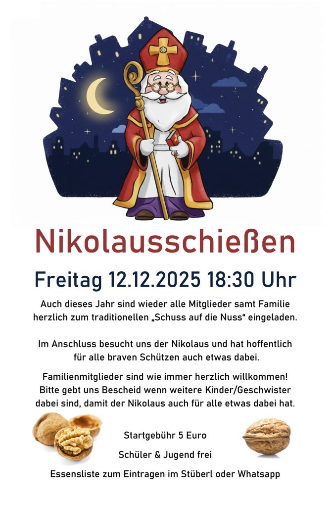 Schießzeiten: Montag Training, Donnerstag Wertungsabend. Für die Jugend ist 18:00 – 19:00 Uhr reserviert.